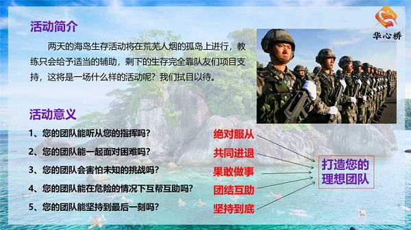海岛生存是近年来流行的企业拓展团建形式之一,置身于荒岛之上,利用仅有的生存物资度过两天的生存挑战,学会生火、取水、搭建帐篷、应急营救、海岛穿越等户外生存挑战,也可定制一些挑战性强一些的项目,例如魔鬼式训练扛圆木、穿越荆棘、扎筏泅渡等,活动形式多样,海岛生存条件相对艰苦,晚上住宿帐篷,靠自带食材进行户外野炊。能很好的磨炼团队的毅力、决心、坚持到底的信心!