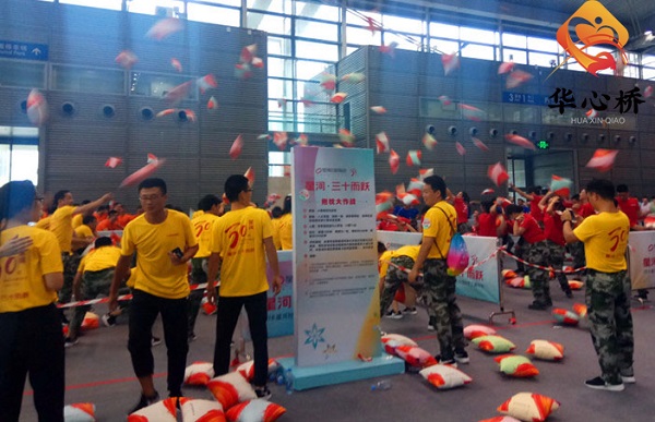 将所有人分为四个小组,再从各自的小组里选出6人,俩人需要背靠背夹住枕头,然后从起点到终点往返两次,往返过程中如果出现枕头落地的2人需要返回起点,重新开始出发。分组当中最先到达终点且枕头掉落次数最少,用时最少的小组胜出。第一名计分为10分,第二名计分为9分,第三名计分为8分,第四名计分为7分。