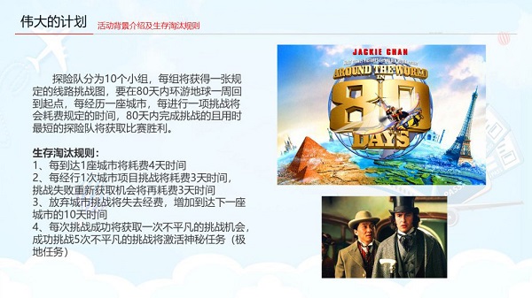 《环游世界80天》主题拓展活动,是华心桥团建首创的越野闯关类型大型团建活动,灵感来源于成龙的电影《环游世界80天》,以环游世界为前提背景,限定80天挑战天数(游戏时间),结合各个国家的文化背景设计挑战项目,集团队性及趣味性为一体,项目规则灵活性高,场地限定条件小,可参与性强。活动开始之前,每个组都会领取到一张通关文牒,上面记录着环游路线、挑战关卡信息等,通俗易懂,依据线路,按最好的成绩完成挑战即可。中间还设置有神秘挑战关卡,丰厚的奖品奖励,还不快来参与进来~